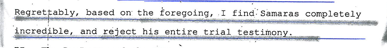 Όσο για τον Αλέξανδρο Σαμαρά είναι ένας ψεύτης και με τη βούλα αμερικανού δικαστή. Δείτε συνημμένο. Παραθέτω την τελική κρίση του δικαστή επί της μαρτυρίας Σαμαρά.