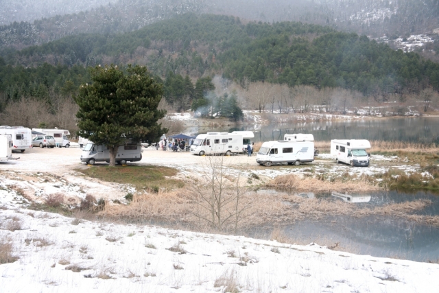 Όταν φθάσαμε κάποια στιγμή στον Φενεό, οι αθλοπαιδειές είχαν ολοκληρωθεί και είχε αρχίσει το φαγοπότι. Είκοσι πέντε περίπου campers ήταν συγκεντρωμένα κοντά στη λίμνη, με το λευκό χρώμα τους να τα κάνει με δυσκολία να ξεχωρίζουν μέσα στο κατάλευκο τοπίο. Παιδιά, νέοι, νέες και "νέοι", ακόμη και εγκυμονούσες, είχαν δώσει το παρόν! Αν και το κρύο ήταν τσουχτερό, το κρασί και τα παϊδάκια διατήρησαν την θερμοκρασία σε ικανοποιητικά επίπεδα...