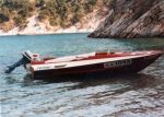 Πες μου όμως κάτι. Ποιος είναι ο κίνδυνος όταν υπερφορτώσεις ένα σκάφος; Να μπουν νερά από τις εξατμισεις των μηχανών και να πάνε μέσα. Έτσι δεν είναι; Στην περίπτωση αυτή, του επτάμετρου Hannibal εννοώ, υπήρχε πολύ μεγαλύτερη επιφάνεια, άρα μεγάλωνε γρήγορα ο όγκος στο πλάϊ και δεν βυθιζόταν πολύ. Κοίταξε στη φωτογραφία πόσο κόσμο έχει επάνω και πού είναι η ίσαλος. Αυτό το σκάφος, που ζύγιζε κοντά στους δύο τόνους, είχε μια μηχανή έσω έξω 125 ίππων! Μετά ακολούθησαν άλλες δύο μηχανές. Μία 165 ίππων, εξακύλινδρη εν σειρά, και μια οκτακύλινδρη "V" 260 ίππων. Με την μικρή μηχανή, το 2,5 τόνων αυτό σκάφος "περπάταγε" με μεγίστη ταχύτητα 22 κόμβων. Στους 16 κόμβους όμως ήταν πλαναρισμένο.
